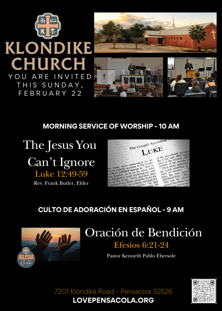 Iglesia Klondike, 9 am: ¡Todos son bienvenidos! ¡Una nueva iglesia en Pensacola! Únase a nosotros todos los domingos a las 9 a.m. Tenemos estudios bíblicos para estudiantes de 4 a 18 años a la misma hora. Lovepensacola.org/Espanol