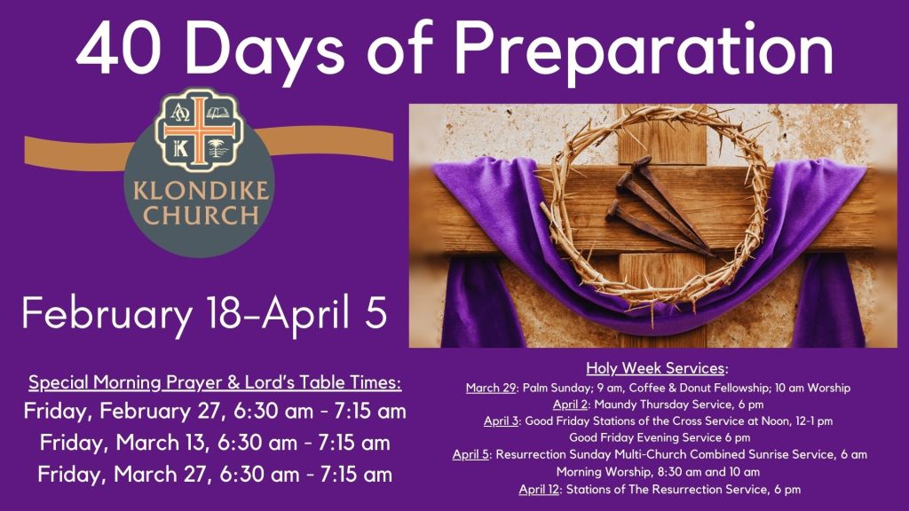 40 Days of Preparation: As a church, we want to intentionally prepare our hearts for Easter, just as we do during Advent for Christmas. For the forty days leading up to Resurrection Sunday, we are setting aside a Season of Preparation: a time of prayer, repentance, Scripture meditation, and renewed devotion — as we walk together toward the cross and empty tomb. This will include: