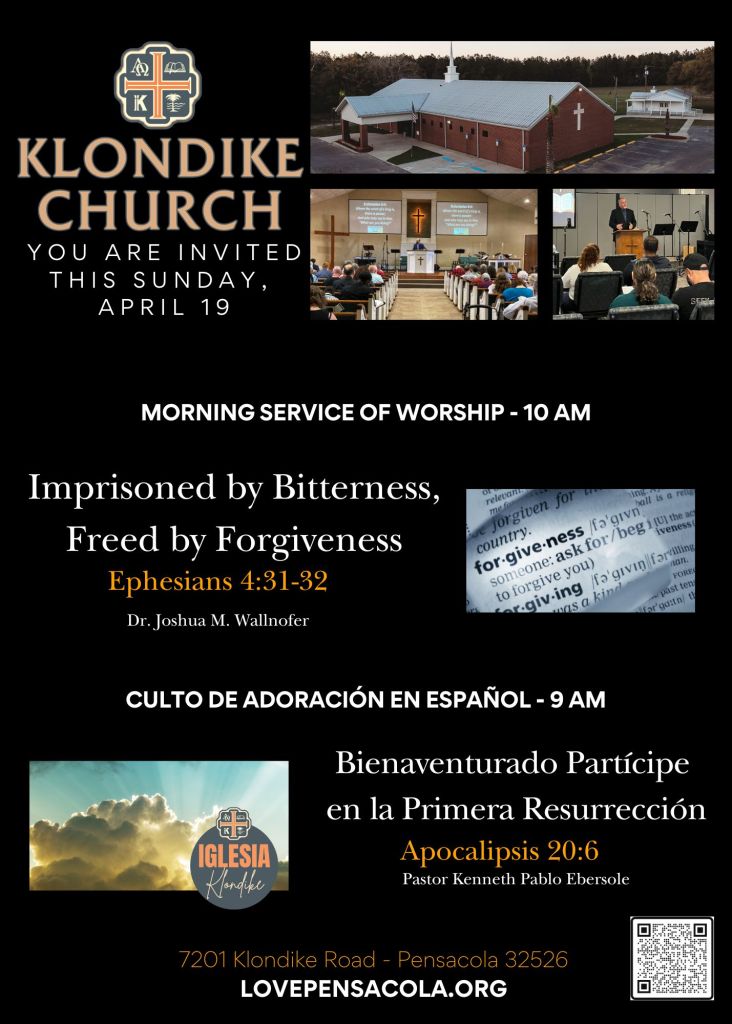Iglesia Klondike, 9 am: ¡Todos son bienvenidos! Únase a nosotros todos los domingos a las 9 a.m. Tenemos estudios bíblicos para estudiantes de 4 a 18 años a la misma hora. Lovepensacola.org/Espanol
