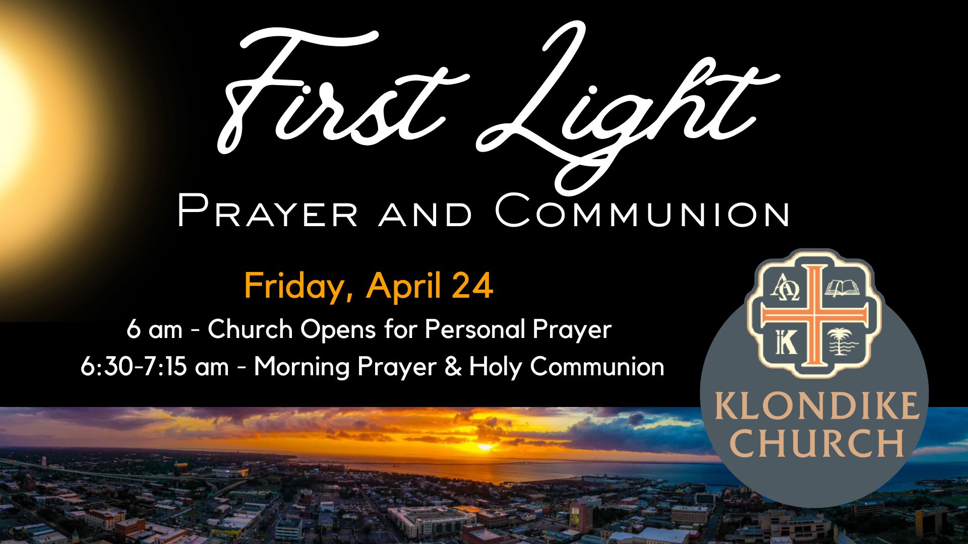 First Light Prayer & Holy Communion: This Friday, April 24th. Start your day in the presence of the Lord. The church will be open at 6 AM for personal prayer, followed by a focused time of prayer and the Lord’s Supper from 6:30–7:15. Come be refreshed, strengthened in Christ, and centered on the gospel before the day begins