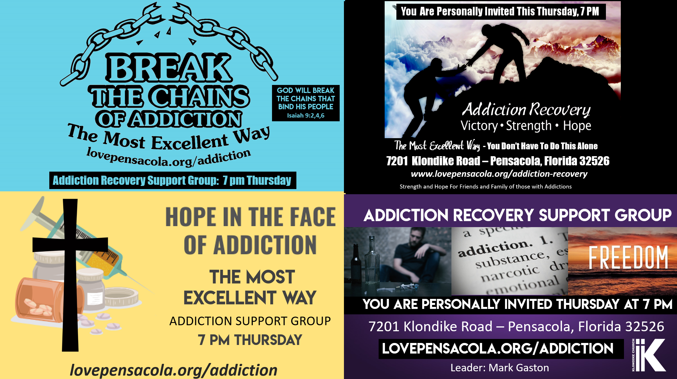 Why Addiction Recovery? 16 million people are currently battling addictive disease in the USA, and 23 million are in recovery. Many of us have learned a lot of bad ways to cope with life, leaving us emotionally incapable of dealing with what is going on. Emotional relapse and trauma always precede substance abuse or physical relapse. Alcoholism, opioids (including heroin), methamphetamine, marijuana, and cocaine are destroying thousands in our community. If you need help, we are here each Thursday at 7 pm. There is hope! Come get the support needed to have freedom from our addictive, compulsive, and dysfunctional behaviors. This freedom fosters peace, joy, and, most importantly, a deeper personal relationship with God and others. Lovepensacola.org/addiction