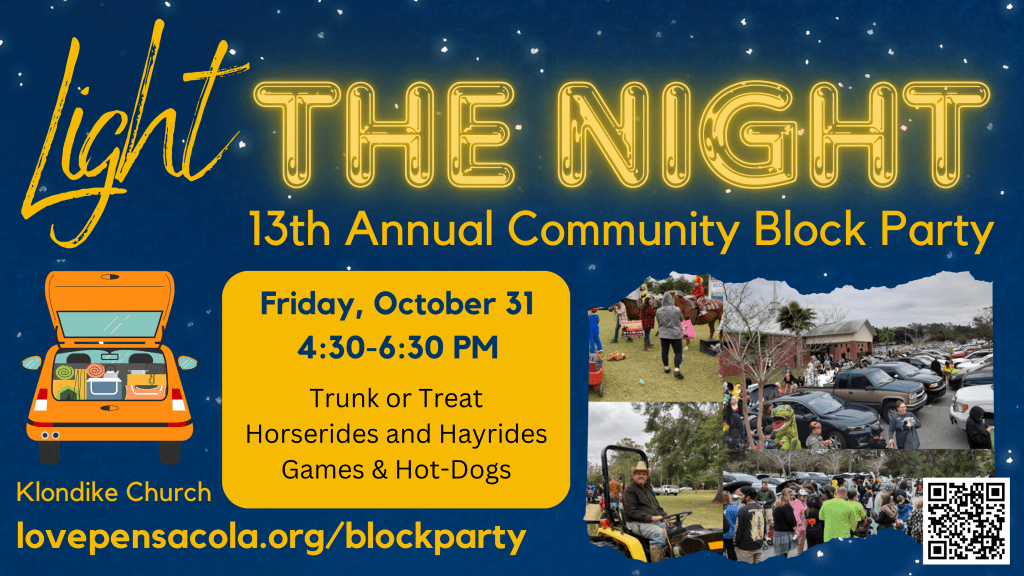 📍 Where? Klondike Church (7201 Klondike Road – lovepensacola.org/blockparty)