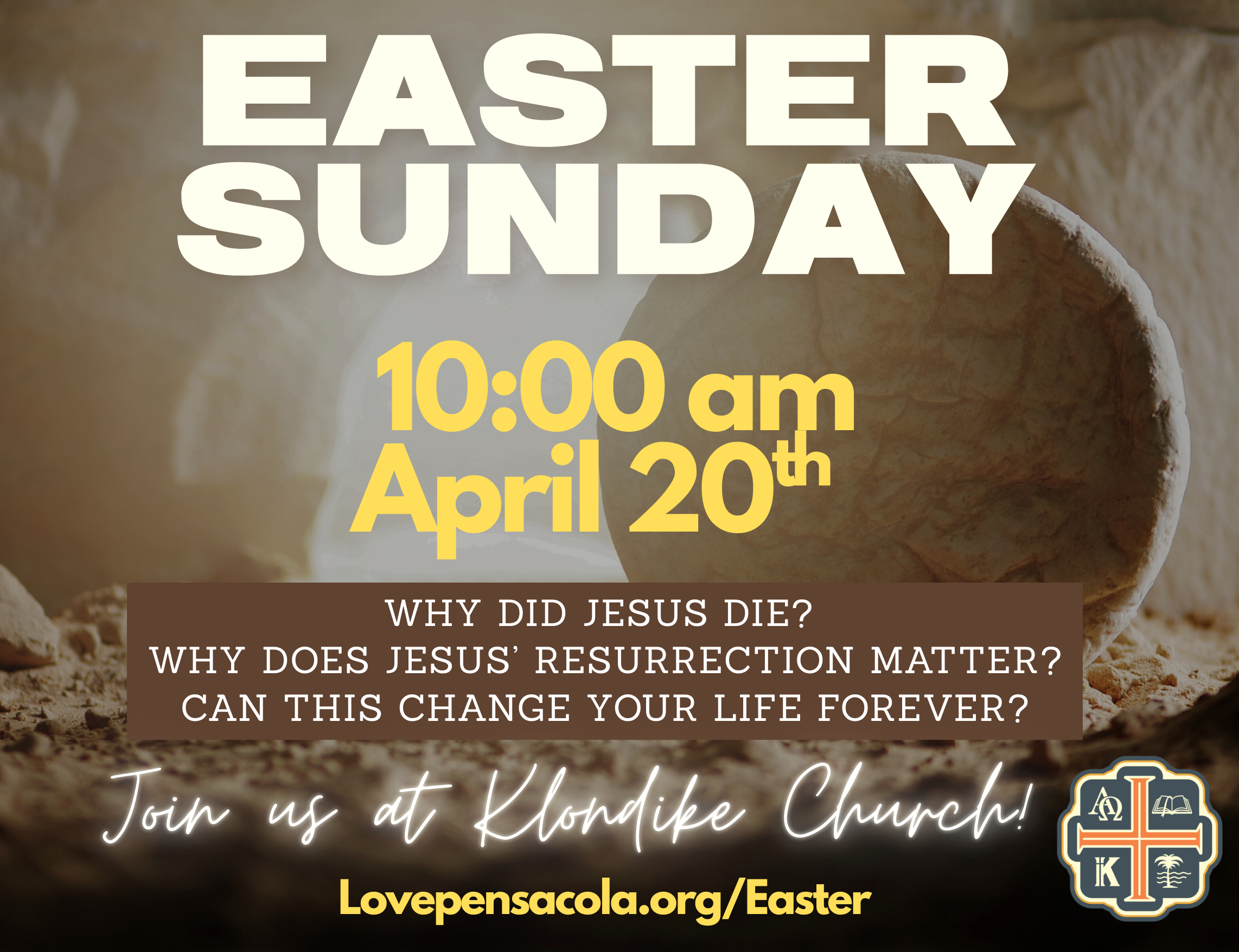 We’d love to invite you to join us this Easter Sunday, April 20th, for a special service that takes an honest look at why Jesus really died and rose again. Whether you’re curious, skeptical, or just looking for hope, you’re welcome to come as you are and explore it with us. Our church is on the corner of Klondike Road and Mobile Highway and close to I-10 exit 7. All are welcome!